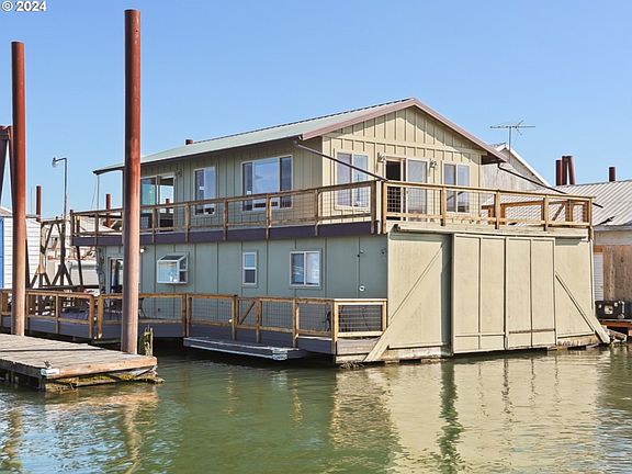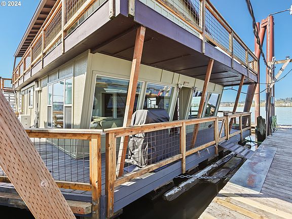 This floating home is in the far outside slip with a 270 degree panoramic view of the Columbia River. The views inside are maximized by walls of windows, blurring the lines between indoors and out and welcoming natural light into the home. The common space on the first floor includes the living room, dining room, and kitchen that are all open to each other and adjacent to the huge deck which also has sweeping views of the Columbia River. This floating house includes wraparound decks on the first and second floors. The boat well, from the boat well door to the tip of the bow area, is approximately 23' and approximately 9' wide. Upstairs is an open concept primary suite with a soaking tub in the NE corner which enjoys views of the river. The suite also includes a large shower and a living area along with access to the wraparound deck through two sliding glass doors.