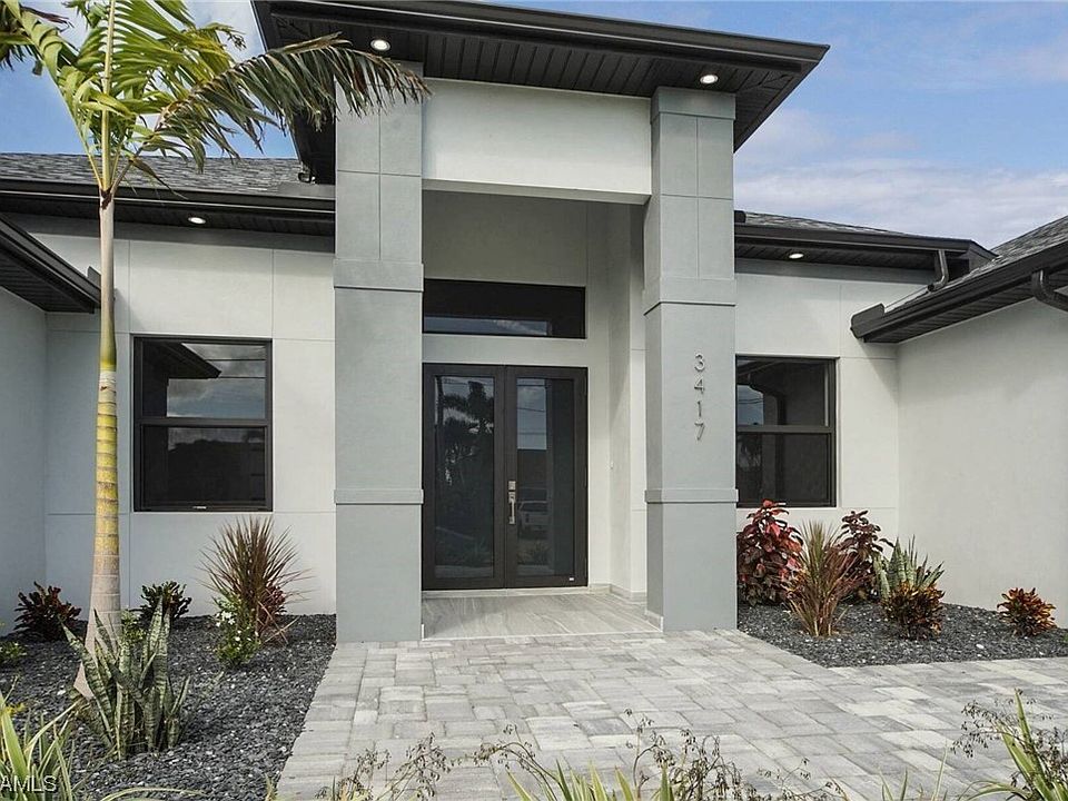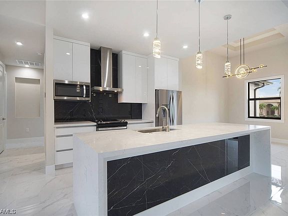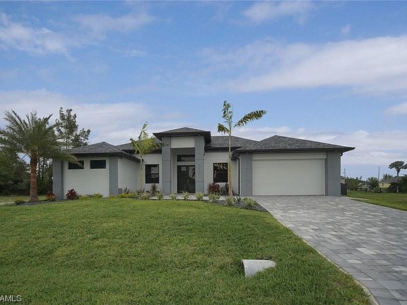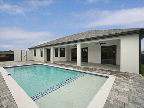 Brand new pool home in beautiful Southwest Cape Coral. Water and Sewer in. $10,000.00 Seller contribution. Contemporary design features 12ft high ceilings with tray ceilings reaching 14ft. Interior doors are 8 ft high. Great room concept, with quartz countertops and waterfall kitchen island. Stainless steel kitchen appliances. European style cabinetry throughout the home. High quality impact resistant windows and doors. 32x32 porcelain tile throughout the home, lanai, and front porch. Floor outlets in living area. Modern Wet Room master Bathroom with 24 X 48 porcelain tile walls from floor to ceiling, multiple shower heads, beautiful stand alone deep bathtub. Approximately 14' x 28' swimming pool with sun deck and bubblers. Outdoor hot and cold shower. Almost 40 ft. long lanai with 32x32 porcelain tile. Outdoor kitchen with gas grill, sink, and quartz countertops. Laundry room cabinets with sink and closet. Epoxy finished garage floors. Impact resistant and insulated garage door. Gutters all around the house. Outdoor lighting on soffits. Wide pavered paths from driveway to front of the house. Excellent location near boat ramp, Joe Stonis Park, grocery stores, and more.
