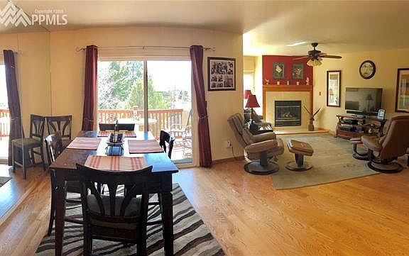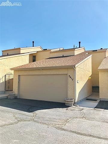 Gorgeous 2-story condo with walkout basement and incredible views of Pike's Peak from any of the 3 back patios. Conveniently located, this 3 bed, 4 bath unit has impeccably maintained wood floors, 2 fire places, walk-in closets, lots of natural light, newer stainless steel appliances, and efficient utilities including a newer AC unit, composite decks as well as a quiet living space (double walled construction -SUPER quiet, cannot even hear the neighbors). There are two bedrooms upstairs each with its own bathroom. Walk-out basement has large bedroom/living space, gas fireplace, walk-in closet, separate bathroom, tons of storage, and access to the grass and treed area out back. Garage has cabinets installed and counter-top perfect for a workbench.