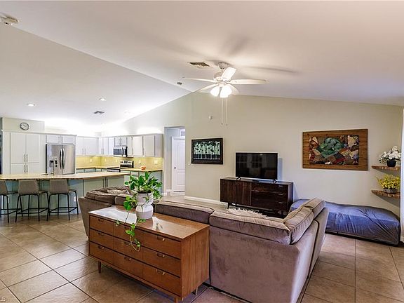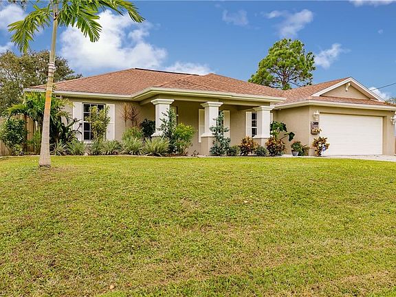 BACK ON THE MARKET. AVAILABLE FOR A QUICK SALE! Great opportunity to own a spacious 3 bedroom with den, 2 bath pool home on an oversized ½ acre fenced lot in Lehigh Acres. This roomy 1,790 square foot home with cathedral ceilings and tile throughout gives you plenty of space to relax or entertain. The newly remodeled kitchen includes a butcher block chef's island, added cupboards and new stainless steel, smudge-proof appliances. The master bath has a Roman-style tub and Corian countertop (in 2nd bath also) and has been updated with a tiled shower and dual-flush commode. The master bedroom has a double closet and a slider to the large lanai with views of the pool and plantings. The guest bathroom has been updated and includes lighting and fresh paint. The library/den with French doors has built-in bookshelves and a closet and can serve as a 4th bedroom. The screened-in lanai and large pool are edged by palms, flowering trees and plants that add extra privacy. Available ADT security system with 3 cameras (owned). This home sits on a large lot with a privacy fence, an 11-ft drive-through gate and a 5-foot walk-in gate. This unique home has lots to offer and will not last!