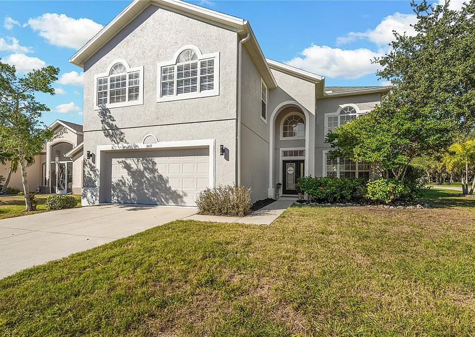 Welcome to this spacious two-story pool and spa home nestled on a corner lot with serene views of the preserve and pond. Boasting 3 bedrooms, 2.5 baths, a den with private door which can be easily converted to a 4th bedroom, and a loft, this residence offers a perfect blend of elegance and comfort. Upon entry, be captivated by the soaring ceilings and abundant natural light that grace the living spaces. Ideal for entertaining, the first floor features a living room, family room, dining room, and an eat-in kitchen with a breakfast bar, all seamlessly connected by tasteful tile flooring and fresh neutral tone paint creating a canvas for any personal style. With so much space you can use as seen or let your creativity flow, a music room, a play area, the choice is yours. A half bath and spacious laundry room near the 2 car garage add practical convenience. Crown molding accents the living areas, complemented by carefully placed accent walls and a charming faux fireplace. Modern door hardware and updated lights and ceiling fans enhance the contemporary appeal. The kitchen, the heart of the home, with Corian countertops opens to all living areas, providing a picturesque backdrop of the pool and spa, as well as the pond and preserve. Ascend to the second floor to discover a cozy loft ideal for a homework space or craft area, two guest bedrooms, a den with a private door that can easily be used as a 4th bedroom, and an extra-large master bedroom featuring two walk-in closets. The master ensuite boasts double vanities, a walk-in shower, and a rejuvenating soaking tub with jets. Outside, the pool and spa await, set against the tranquil panorama of the pond and preserve—a perfect oasis for relaxation. Recent updates include two newer air conditioners (replaced in 2021 and 2022) all new carpet, and a new gas heater for the spa and pool. Situated in the charming Oakley Place neighborhood, this home is conveniently close to shopping, the Ellenton outlet mall, I-75, an array of waterfront dining options, and Anna Maria Island for the best of the Gulf Coast beaches. Low HOA and NO CDD. Embrace the lifestyle this well maintained residence offers, combining modern comforts with the tranquility of its natural surroundings.
