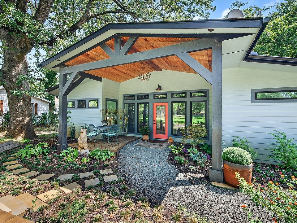 Fully fenced yardStainless-steel appliancesSoaring wood-accent ceilingsLush landscapingMature treesSpacious covered porchCustom cabinetry
