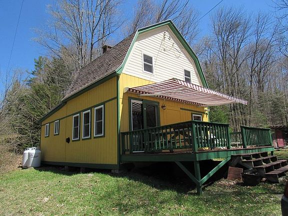 This camp is known as the " Deer Crossing Camp" that sits up high off the road with the mountain ridge views and no visible neighbors. The road frontage is 600 feet and the property is 3.8 acres. The property has been used as a hunting camp since 1945 with old photos and history to be passed along.Many renovations have been done with the current owners. There is a kitchen now and a composting toilet inside, along with a standard set of stairs leading upstairs with a railing.The heat is 2 pellet stoves and a propane wall unit. Also includes a heated outhouse and a separate outside shower with hot and cold water. There is a garage for your snowmobiles or car and an additional shed for storage.The deck faces out with southern exposure and an awning for shade. The kitchen is open with a dining area and a pellet stove. There is a living-room with another pellet stove and a propane wall unit between the two rooms, all done in knotty pine. There is a composting toilet in the back room and stairs off the kitchen to a loft area with two more bedrooms.This a true Adirondack hunting camp.