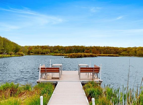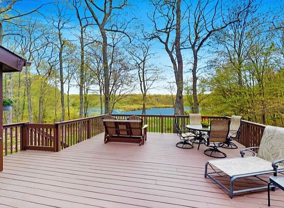 LAKEFRONT CONTEMPORARY ON .73 ACRES WITH 194' OF FRONTAGE ON FAWN LAKE-MILFORD!Featuring 4 Br's, 2.5 baths, oversized Mstr bedroom, luxurious bath with large soaking tub and stall shower. Custom Kitchen w Birch cabinets, granite countertops, center island, and S S appliances including 2 ovens and new refrigerator! Living rm with brick propane fireplace, laundry rm, loft area, full walkout finished bsmt has Recreation room, half bath, guest bedroom and sliding glass doors to 2nd lakefront deck. Special features include leaf-filter gutter protection, and the interior was just freshly painted! Super location featuring level lakefront yard, private dock and extra-large 24x20 entertaining deck offering views of the beautiful spring-fed lake. Relax in the screen-enclosed porch off the dining rm!