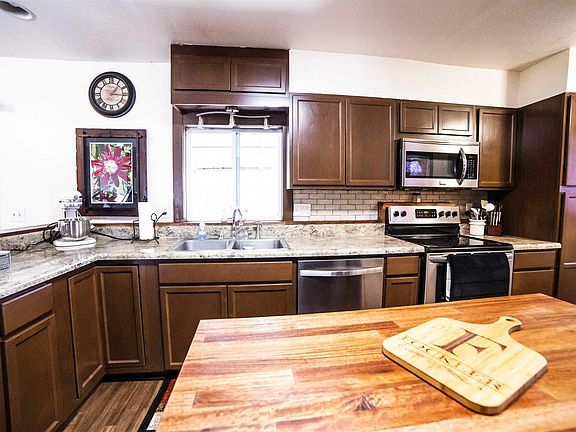 - Kitchen: Bar, Counter Tops-Formica, Eat In, Pantry, Island, Floors-Laminate, Backsplash-Tiled, Cabinets-Painted, Ceiling Fan