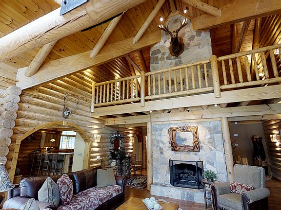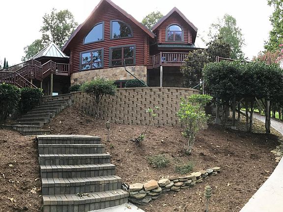 This Beautiful Lake Front full log home is located on a 1.14 acre gently sloping lake front lot. 4 bedrooms, 4 full and 2 1/2 baths. Featuring cathedral wood ceilings through out. Main level has large open great room with fireplace, modern kitchen with Hickory cabinets, dining room, 1/2 bath, laundry room and Master bedroom suite with garden tub and walk out private deck. Upper level has 2nd Master suite plus 3rd bedroom and bath. Balcony over looks living room. Lower level has large family room , kitchenette, fireplace, large game room, 1/2 bath and 3rd Master suite w/garden tub. Walk out deck to new hot tub, steps to large patio and cart path to firepit and lake, covered dock with lifts and 2 jet ports and swim platform. Home is full log with metal roof and is 4880 sq. ft. +garage