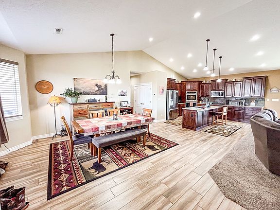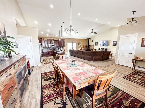 Nestled in a peaceful neighborhood with breathtaking views of the Ruby Mountains, this well-maintained 4-bedroom, 2-bathroom home offers both comfort and style. Sitting on a fantastic 4.34-acre lot, there's plenty of space to build your dream shop while still enjoying wide-open views. The spacious kitchen is designed for both functionality and entertaining, featuring a large island, modern appliances, a propane cooktop, and a double oven-perfect for meal prep. The home features beautiful tile flooring throughout, along with soft-close drawers for added convenience. The master suite is extra spacious with a generous walk-in closet, a separate toilet room, a walk-in shower, and a relaxing garden soaking tub. Step outside to enjoy the backyard, complete with a covered patio and a large seating area. Enjoy stunning mountain views in a serene setting!