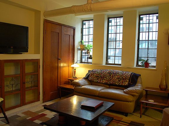 Semi-sublevel residence located in a Historic Landmark apartment building with wall-to-wall carpet, built-in cabinets throughout, kitchen with refrigerator and range, private storage lockers and coin-operated laundry facilities available in building. Resident is responsible for electricity. Heat is included in the rent.
