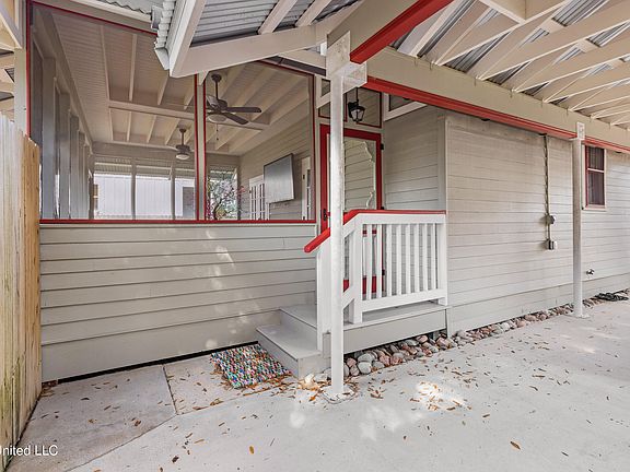 Attached carport with an entrance to a large and screened back porch off the kitchen and back bedroom, with seating, and several electrical outlets. This spacious back porch overlooks a charming firepit and patio landscaped with different varietals of mature palm trees. A great private area to socialize outside, in addition to the front and screened back porch. There is also a terrific shed with porch crisply painted in the exterior colors of the house itself. This shed has electricity, water, and an ac! It also has covered parking for a golf cart, which can access the back yard from either side of the house. Storm shutters for the windows of the house decoratively adorn the back fence. 3 blocks to the Municipal Marina and sea wall. 1 block to Main St. Flood zone X. Stroll or take your golf cart to the restaurants, shops, coffee houses, and entertainment that Old Town Bay Saint Louis has to offer. Porch swing will not convey with the sale of this house.