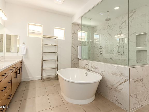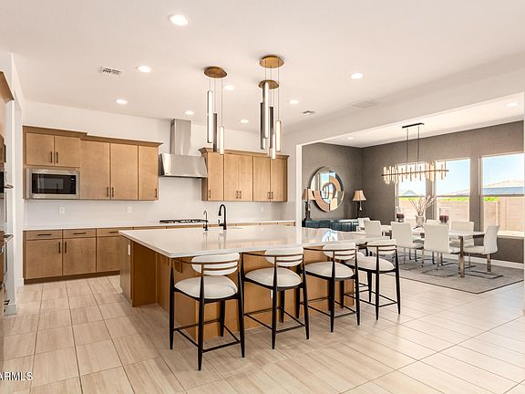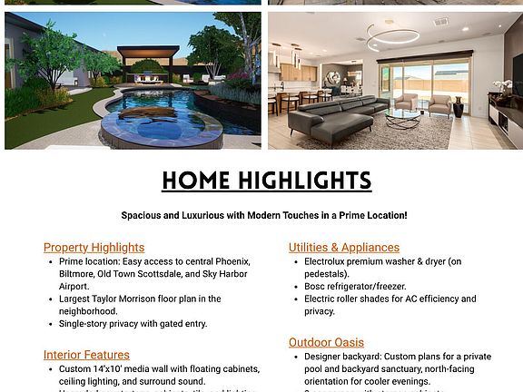 Discover contemporary living in the gated Gardener's Enclave community! Soaring 10' ceilings, electric shades, and natural light enhance the great room layout. The gourmet kitchen impresses with quartz countertops, floating soft-close cabinets, GE double wall ovens, and Bosch fridge, and stainless steel appliances. Retreat to the primary suite oasis, complete with an electric fireplace, a spa-like bath with a rain shower and soaking tub, a dual-sink vanity, and private backyard access. Each guest room features a walk-in closet and an en suite. Upgrades include built-in speakers in the living room and covered patio, water softener, Electrolux washer and dryer, and SimpliSafe security system. The 3-car garage includes built-in cabinets. Conveniently located near shopping, dining, and more!