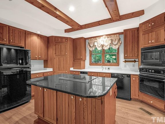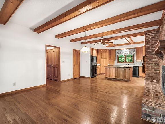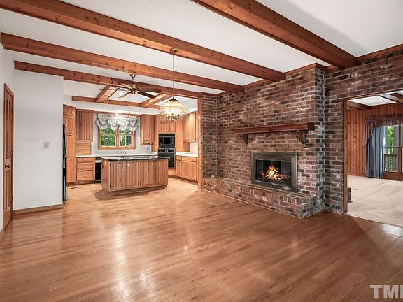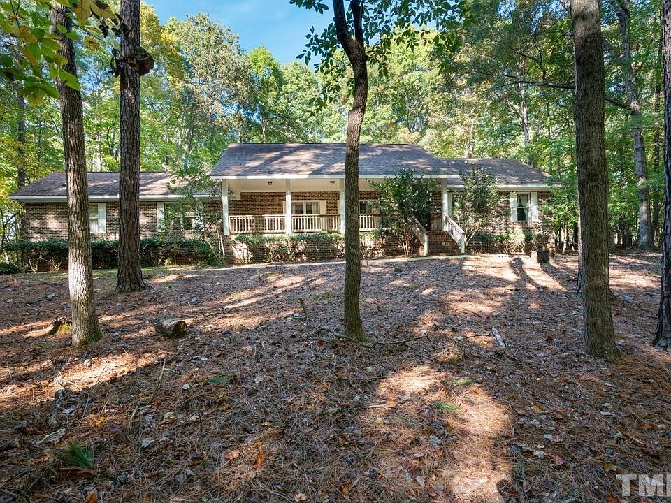 All Brick 4 bedroom home on 4.5 acre heavily wooded lot-no city taxes. Hardwood floors in kitchen, dining & foyer. Laminate floors in Master Bedroom with two walk-in cedar closets. Master bath w/ whirlpool tub, separate shower, skylights, and full size laundry. 6 ceiling fans throughout. Kitchen w/ granite counter island, smooth cooktop, walkin pantry and dining area with brick fireplace. Family Rm w/ fireplace & fan. Front & Rear covered porches. Large 2 car garage. I540 noise wall-view under documents