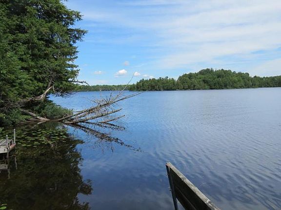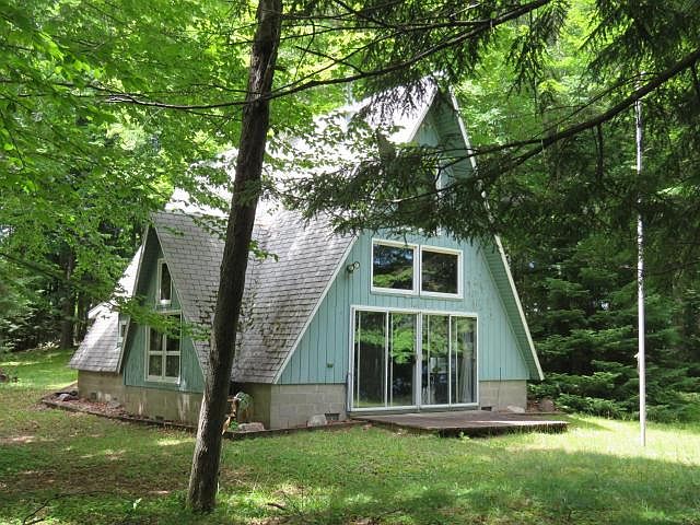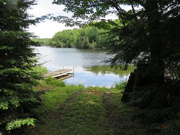 Private Boat Launch area -- pretty important on a lake with no public boat launch such as beautiful 319 acre Armour Lake! Adjacent to the launch area is a 1965 vintage A-Frame dry boathouse to match the A-Frame 2 BR 1 BA cottage just yards away. All situated on FOUR HUNDRED feet of gorgeous sand and gravel frontage bedecked with hardwoods and hemlocks. Yes, the cabin is due for an updating, and the buildings need maintenance, but what a location! Buildings can be updated or replaced, but the land is what it is NOW and FOREVER, and THIS is the land that you want. Simple and functional 950 sq. ft. cottage, but with an authentic Northwoods vibe, courtesy of the soaring beamed ceilings! Double patio doors lakeside. The cottage is on a point, so lakeside stretches around the cottage almost 180 degrees. The 24x21'6" dry boathouse has a wood stove and second level bunk room. Detached 24x24 garage and 20x26 carport. Private easement road access from town road. Furnishings included.