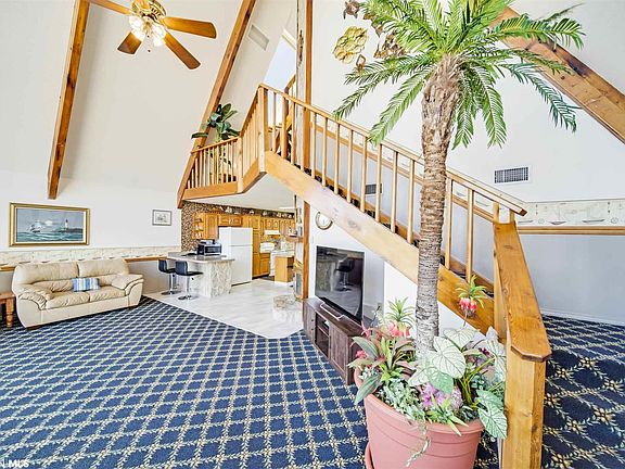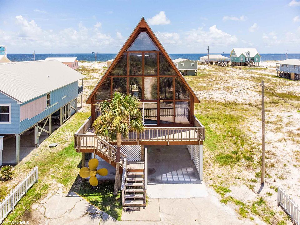 For the first time ever, the iconic Wheel House in Fort Morgan is being offered for sale! It's unique A-frame structure with 42-foot ceilings and large exposed redwood beams that span the entire house make this home one-of-a-kind. With almost 2,800 square feet, five bedrooms, a large third floor loft, seven beds, and five bathrooms, there is plenty of space to entertain family and friends. The house is perfectly situated on a large lot and offers easy beach access and expansive water views over the Gulf of Mexico and Mobile Bay. Home features include an abundance of natural light, a fireplace, commercial grade ice maker on the back porch, large outdoor shower and bathroom, marked parking for up to ten cars, and an updated kitchen with granite countertops, tile backsplash, and bar seating for six. The house was built to withstand the test of time and rests on large pilings sunk deep into the ground with 2x8 exterior walls and 2x6 interior walls. Don't wait & the time to start making memories is now!
