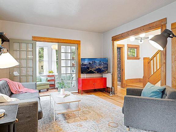 The cutest Powderhorn charmer with a private backyard oasis just a block from the park! Enjoy its preserved character along with many smart updates including newer mini-split AC throughout the home! Rare main-level bedroom and full bath with large tub and walk-in shower. Front entrance welcomes guests with its covered porch, vestibule and gracious foyer. Cozy 3-season front sunroom with french doors extends to the open living and dining areas. Kitchen updated with new stainless steel appliances including Bosch dishwasher and an induction range. Upstairs enjoy another full bath, 2 bedrooms with designated AC units, and a large lovely sunroom off the primary bedroom. This quiet versatile space overlooks the backyard gardens with direct access to outside and a cozy upper deck. Front, back and side yards are lush with beautifully landscaped perennials including fruit trees and raised beds for gardening. Backyard haven is fully enclosed with newer Western Red Cedar privacy fence – an ideal spot for summer cook-outs or fall gatherings. Additional updates include new roof (2021), new washer/dryer (2023), new water heater (2025), and more. All original wood floors professionally refinished in 2024. This home has been loved, and it shows!