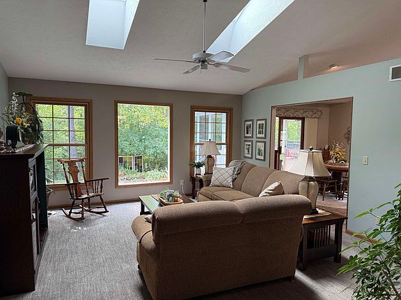 Very well maintained 3 bedroom, 2 bath condo with 2-stall attached garage. The living room and open kitchen & dining area has vaulted ceilings and skylights. Off of the kitchen there is a pantry and main floor laundry. The primary bedroom has a large closet and bathroom with dual sinks and linen closet. There are two more bedrooms on the main level, which one of them is currently being used as an office, and another full bath. Off of the dining area there is an enclosed porch and there is also a deck off of that. The partially finished basement has plenty of space to put finishing touches for a family/rec room and it also has a workshop area and storage area. Updates include roof & skylights in 2024, central air & water heater in 2022, windows in 2021 and furnace in 2015.