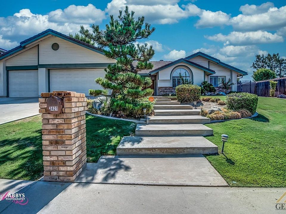 Bakersfield Beauty with a 4 bedroom plan, 2.75 baths and 3-car garage home. This property features vaulted ceilings, crown molding, newer flooring, custom trim doors, formal living, formal dining area, a great room with a fireplace. This major remodeled custom kitchen offers Stainless steel appliances, granite countertops, breakfast bar and kitchen nook. The master suite has access to the backyard, a full bath with double sink, granite countertops, heated flooring, separate tub plus shower and walk-in closet. The two guest bedrooms include a Jack and Jill bath perfect to welcome your guest with privacy. The 4th bedroom is used as an office with built in cabinetry. There is an indoor laundry room with plenty of cabinet space and a sink. The backyard has a covered patio, Built in BBQ, nice lush greenery and a sparkling pool perfect for those hot summer days. All in a cul de sac location and with tile roof.