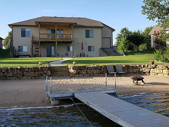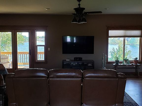 Welcome to Bluelake, where everyday feels like a vacation! Enjoy boating, fishing, kayaking, sailing, paddle boarding and swimming with your private beach and boat dock. Boat is negotiable, the 41 acre lake is stocked. This lakeside home has gorgeous views of lake, immaculate landscaping and limestone boulder wall at the beach. Sprinkler system and well that pulls water from the lake. Don't miss out on this 4 bedroom. 3 bath, 4+ finished oversized garage home with a walkout basement. This home features open layout, wood floors, granite countertops, large walk in pantry, upstairs laundry, 2 bedroom, 2 bathroom upstairs, a nice covered deck overlooking the lake. The basement has a large rec room , wet bar with granite countertops, a full brick gas fireplace, 2 large bedrooms, 1 bathroom, storage room and safe room. The home has blown in insulation, 95% high efficiency furnace with humidifier, 15 seer A/C. The guttering is connected to french drains underground that run to the lake. Anderson patio doors to the outside where there is a  large cement patio with sidewalks to the beach. Specials end this year.