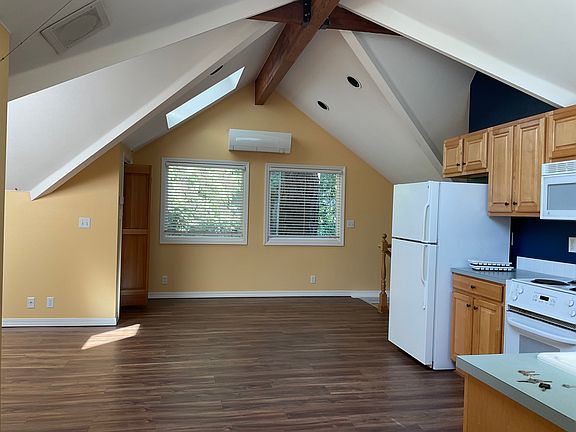 Light-filled, vaulted, 760 square-foot, second-story studio apartment, over detached garage, with multiple skylights.