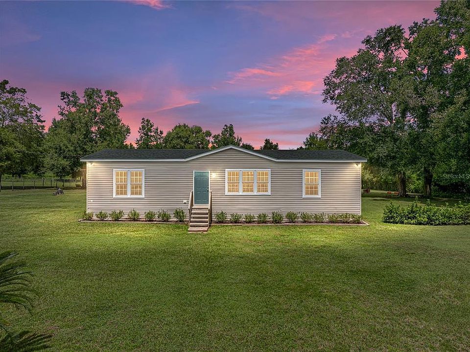 Perfectly situated on over 1.5 acres in the rolling hills of Dade City's Blanton area, this like-new 3 bedroom, 2 bathroom manufactured home presents an amazing opportunity for rural living with modern comforts. The gated and fenced property welcomes you with lovely mature landscaping and a generously sized yard that leads to the home and the expansive pole barn/workshop in the back- it is a car lover's dream! Step inside the home to a sweeping open floor plan enriched with natural light and an easy flow for entertaining. The 22x12 living room offers plush carpet flooring, 9 ft ceilings, traditional drywall (no manufactured paneling in this home!), extra double pane windows, and 5" painted crown molding throughout. Featuring luxury vinyl plank flooring, an oversized central island with breakfast bar seating and storage, a 4 piece appliance package, cabinet pantry storage, and a decorative backsplash, this chef's kitchen is well-equipped to bring your culinary dreams to fruition! The primary bedroom is a tranquil retreat after a long day. Split away from the secondary bedrooms, it has a large walk-in closet, plush carpet flooring, and an ensuite bathroom with dual sinks and a walk-in shower. Both spacious guest bedrooms have walk-in closets, ceiling fans, carpeted flooring, and easy access to the full guest bathroom with a tub/shower combo. Relax and unwind from the covered back porch, garden in the vast lush yard, or tinker in the pole barn/workshop with a car lift, a utility bathroom, a workshop, covered storage, plumbing, and electrical. Enjoy the best of both worlds in this private rural location close to Dade City's amenities and major highways for easy access to Tampa and Orlando. Call us today for your private viewing.
