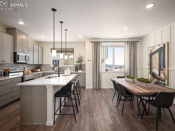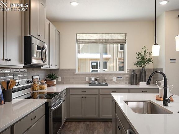 MODEL HOME FOR SALE! Enjoy premium lifestyle and modern living conveniences as they converge in this stunning turnkey townhome located near Garden of the Gods! You’ll enjoy Pikes Peak views along with upgrades and premium finishes, and a thoughtful layout with effortless style! Every detail has been crafted to elevate your living experience; from the chrome Kohler hardware to the upgraded carpeting, window treatments, custom paint and wall finishes, extended hard surface flooring, ceiling fans and light dimmers; creating a warm, modern aesthetic you’ll love. The chef will love the gourmet kitchen, featuring a sleek Samsung gas range, elegant white quartz countertops, and gray dovetail cabinetry with soft-close doors for a seamless, sophisticated touch. The stylish gray subway tile backsplash and stainless steel sink add a contemporary flair, making this kitchen the heart of the home. A large island with counter seating enhances dining options! The open-concept great room flows from the kitchen/dining area and boasts extended hard surface flooring, providing the perfect setting for entertaining or relaxing with family and friends. Gorgeous windows invite natural light, creating a warm and inviting ambiance throughout that adds character and charm to the space. The primary suite is a true retreat, featuring Wainscoting detail, a spacious walk-in closet, dual vanities, and an indulgent shower. A separate door to the bathroom ensures peace, turning your suite into a sanctuary. Two additional bedrooms, a full bath, and a laundry room complete the upper level. The lower level offers a versatile bedroom with a two-tone painted accent; ideal for guests, a private home office, or a personal gym. The fully finished garage offers ample storage, ensuring both convenience and functionality. Centennial Townes is conveniently located near shopping, restaurants, health care, entertainment, and outdoor activities with easy access to I-25 and the great outdoors!
