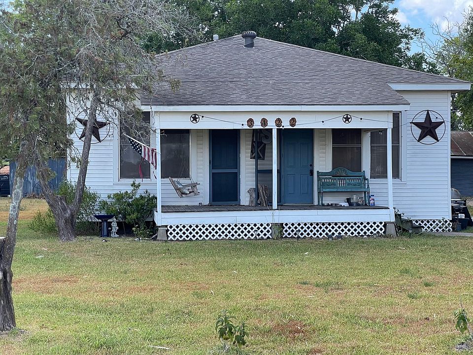 Cute farmhouse style home on 1.5 Acres. Easy access to 59. This home needs some TLC but the possibilities are endless. Back porch has been closed in and hosts an additional half bath as well as lots of space for storage and laundry room. Living area and bedrooms have new laminate flooring and kitchen has been painted and new flooring. Central air and heat were installed 4-5 years ago. Property has two driveways and an rv pad with electrical hook up.