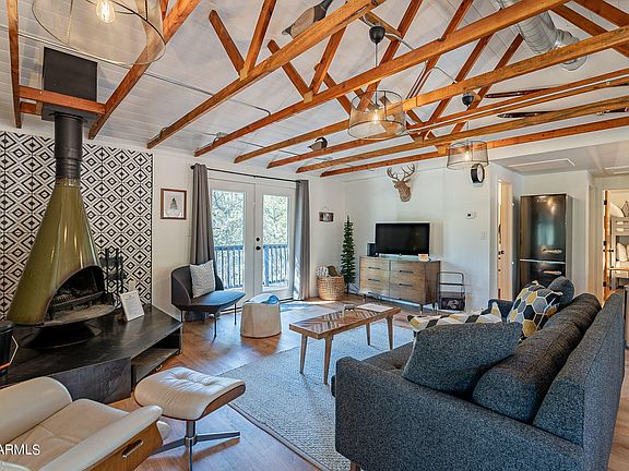 Beautifully RENOVATED MID-CENTURY MODERN cabin perfectly situated at the end of CUL-DE-SAC on a 17,604 sq ft lot surrounded by ponderosa pines.Walk in to this 2 bed/1 bath home featuring VAULTED tongue & groove ceiling with EXPOSED RAFTERS, a stunning VINTAGE WOOD-BURNING FIREPLACE surrounded by geometric black/white tile on a custom steel base, LUXURY VINYL PLANK floors, QUARTZ countertops, FARMHOUSE sink, 200 sq ft SHED w/ electricity, and much more! French doors open to the WRAP AROUND DECK where you can watch the sun set over Strawberry Mountain or marvel at the ELK passing through. Completely REMODELED at the end of 2021 including METAL ROOF with COPPER gutters & snow guards, water heater, pex plumbing,Heat pump/AC w/ sub panel, new fixtures and new appliances. MUST SEE!