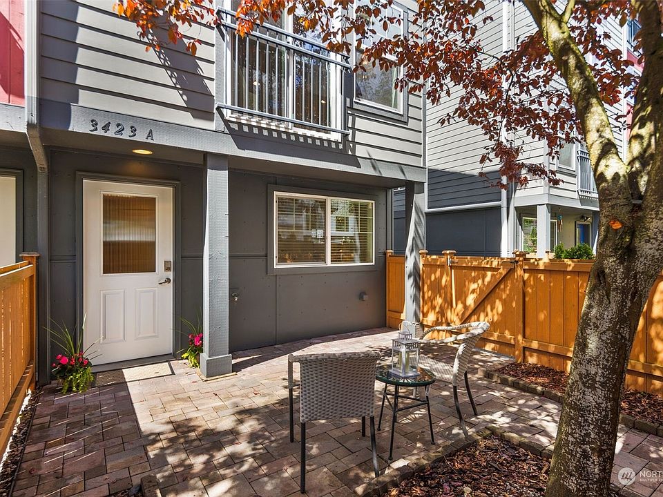 This stunning townhome offers contemporary elegance and thoughtful upgrades throughout. An open layout and bamboo floors create a seamless flow between kitchen, dining, and living areas, enhanced by a fireplace and large windows. Chef's kitchen features ample counter space, SS appliances, gas range, and abundant storage. The newly carpeted 3rd level with 2 large bedrooms, full bath, and convenient laundry offers comfort and style. The top level is devoted to the primary suite with vaulted ceilings, wood plank floors, luxe bath, and walk-in closet. The entry level office overlooks the private courtyard. With a 1-car garage, no HOA dues and a prime location in West Seattle, this townhome combines sophisticated living with convenience.