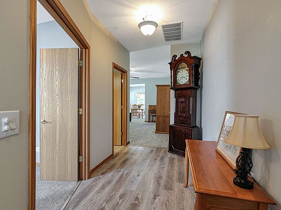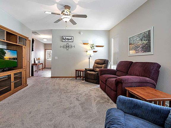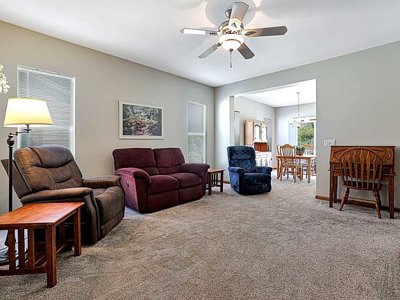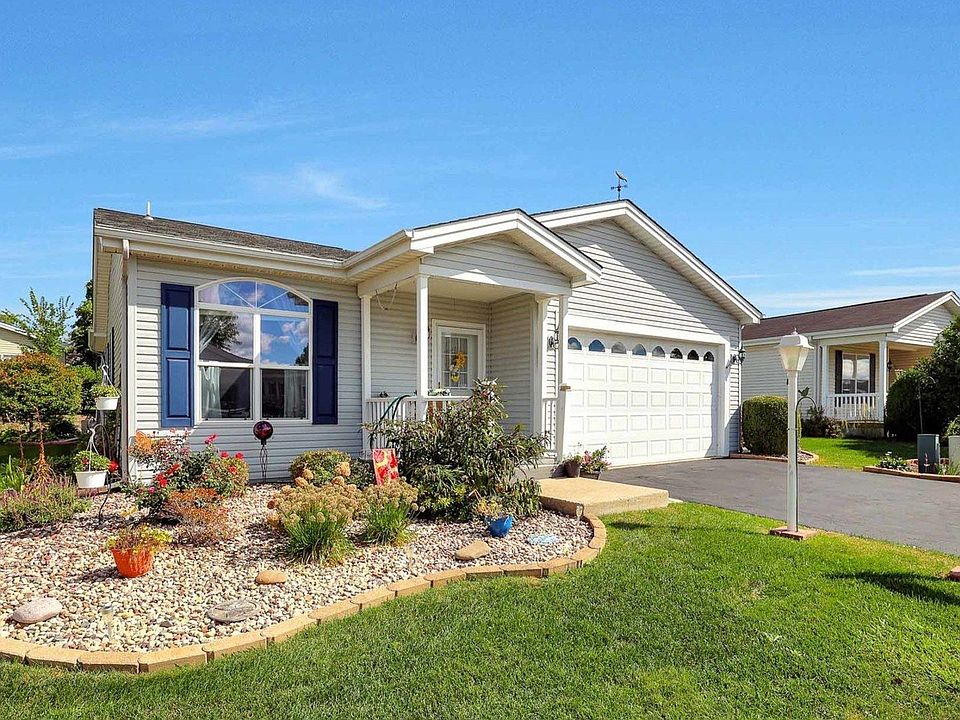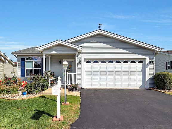 Updated two bedroom ranch home in Saddlebrook Farms! The composite front porch (no maintenance) welcomes you. Step inside to the large foyer. New luxury vinyl "wood-look" flooring and new carpeting in 2020. At the front of the home you will find the 2nd bedroom and full bathroom with walk-in shower. The large living room is open to the dining room. Light and bright kitchen features stainless steel appliances and eating area. The master suite features a walk-in closet, linen closet and private master bathroom with walk-in shower (new in 2021). Laundry/mud room has washer & dryer and more closet space. Backyard is very private as it backs to a berm. Enjoy evenings on the large composite deck (no maintenance) listening to the pond with waterfall feature. Also included are the deck boxes and raised garden bed. New roof in 2019. New furnace in 2017. Saddlebrook Farms is an adult community and offers a club house, fitness center, walking paths, catch and release fishing, community garden, group activities and much more.