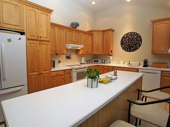Beautiful Setting & Design! This open concept 2 bedroom home boasts lots of features, ceramic tile, hardwood floors, crown molding, recess lights just to name a few. 12' ceiling in the living room with a gas fireplace, full wall of windows and atrium door leading to the wood deck. The kitchen features 42" upper cabinets, center island and pantry. Large master bedroom with larger master bath offering 2 vanities, whirlpool garden tub, shower and walk in closets. Full unfinished daylight basement. 2 car attached garage.