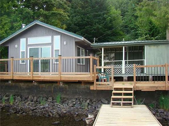 LAKEFRONT COTTAGE Beach shack sits right over the lake with shorelands ownership. Nice deck with 61' of lakefront and dock. Most of the land is across the street, ample room for septic installation and building site. $259,000