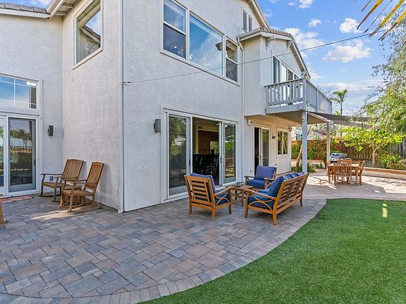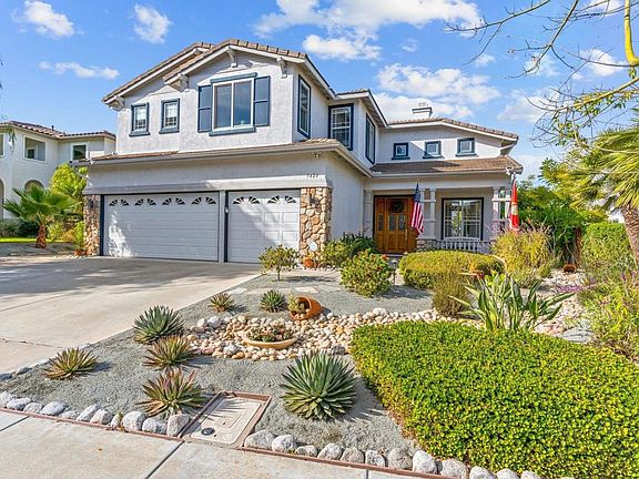Desirable home in the coveted Santa Fe Trails neighborhood set on an elevated view lot. Beautiful interior that features a vaulted living room with two story windows, doors to the backyard and a fireplace and a private dining room with custom wood paneling, large picture windows and a sliding door. The spacious family room includes custom built-ins, wine storage, surround sound, double doors to the back and a fireplace. The gourmet kitchen features custom Honduran mahogany cabinetry, a center island with storage, granite countertops, a reverse osmosis system, a Bosch dishwasher, a Sharp undercounter microwave and KitchenAid appliances that include a double oven, gas range, trash compactor and wine refrigerator. The home also has a large interior laundry room with custom cabinetry, ample storage, a sink and access to the side yard, as well as a remodeled powder bathroom, and a three car garage. Upstairs features a large primary suite with a view deck, spa-like bathroom with dual closets, a large shower and jet tub. An oversized retreat area off the primary bedroom is perfect for an office or gym. The retreat can also be modified into a separate bedroom from the hallway. In addition, upstairs there are three bedrooms and a remodeled secondary full bathroom with dual sinks. The home has just been painted and had new carpet installed. North westerly facing backyard with a covered patio seating area, mature landscaping and plenty of room for entertaining. Additional features include: solar, a whole house back up generator, two zoned heating and AC and upgraded lighting. Wonderful neighborhood with parks, trails, low HOA fees & convenient location. Close to shops, restaurants, entertainment, parks, and centrally located between these top schools: Olivenhain Pioneer Elementary, Diegueno Middle School, and La Costa Canyon High School.