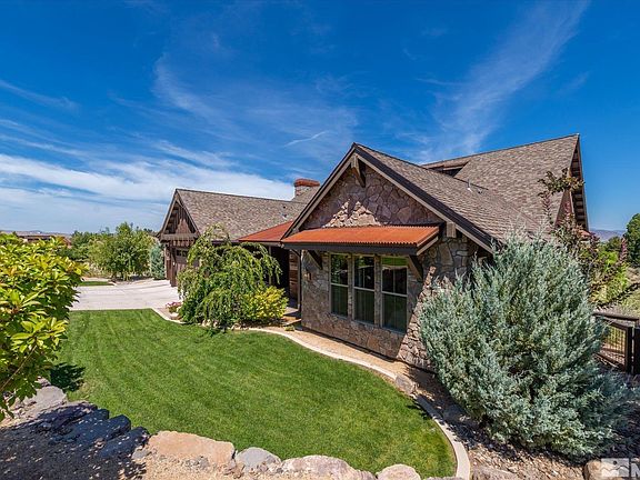 This stunning one of a kind 4 bedroom 3.5 bath mountain modern home sits on a meticulously landscaped cul-de-sac lot boasting the most spectacular panoramic city views. Home is located in a highly desirable and convenient area. The bright and functional floor plan is ideal for entertaining and features an open great room concept with a 12' sliding glass door unit that leads to an expansive covered patio. The outdoor living space showcases the beautiful sunsets and city light views., The interior designer finishes are of the highest quality including solid stone countertops; wide plank white oak flooring; knotty alder cabinets with soft closing doors and drawers; gourmet kitchen with high end stainless appliances; custom woodwork throughout; and spectacular lighting fixtures. The primary suite defines luxury with a ledgestone clad fireplace and spa-like retreat bathroom which features a jetted tub, large shower with 3 shower heads, heated floors, dual vanities and a custom walk-in closet. The home features speakers and amps throughout including integrated speakers in the backyard landscaping, all easily controlled through Sonos. This is a rare opportunity for a discerning buyer to own a recently built architecturally stunning custom home in a fantastic central location with some of the best views Reno has to offer.