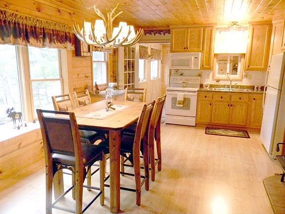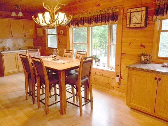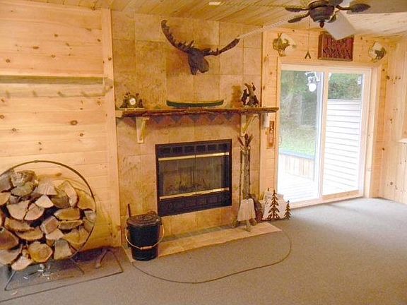 Beautiful, Adirondack style home completely remodeled in 2008 and 2009. Garage is heated and has a living room and upstairs game room or dormintory sleeping room. Wood interior with fireplace, thermal windows and new metal roof. 12' X 24' deck with outdoor firepit for relaxing. Additional garage for storage. All new inside and out with plenty of parking for snowmobile sleds, trailers and other toys. Access to Trail 5 nearby. Fully furnished and applianced and ready to go! Lake rights to HH beach