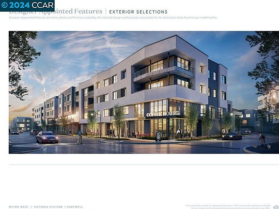 The Hartwell is the ideal setting to complement every lifestyle with a beautiful extended foyer that reveals the spacious great room with desirable access to the rear covered balcony. Central to a bright casual dining area, the kitchen is well appointed, featuring an impressive center island with breakfast bar, wraparound counter and cabinet space and a roomy walk-in pantry. The tranquil primary bedroom is defined by an expansive walk-in closet and lovely primary bath that comes with dual vanities, a luxe shower with seat, and private water closet. Adjacent to the centrally located laundry, sizable secondary bedrooms feature ample closet space and a shared hall bath, with plenty of additional storage found throughout the elegant Hartwell. This intimate 14 home condominium building has a roof top deck with bar-b-que, fire pit, and seating area to enjoy with family and friends. Exclusive to this community comes with the comforts of a movie screening room, dog washing station, shared office work space, and entertainment kitchen area. Great commute location with easy access to 680 and 880 as well as walking distance to BART. Close to the 'High Tech' industry and great schools make Metro West Victoria Station the place to be. Schedule an appointment.