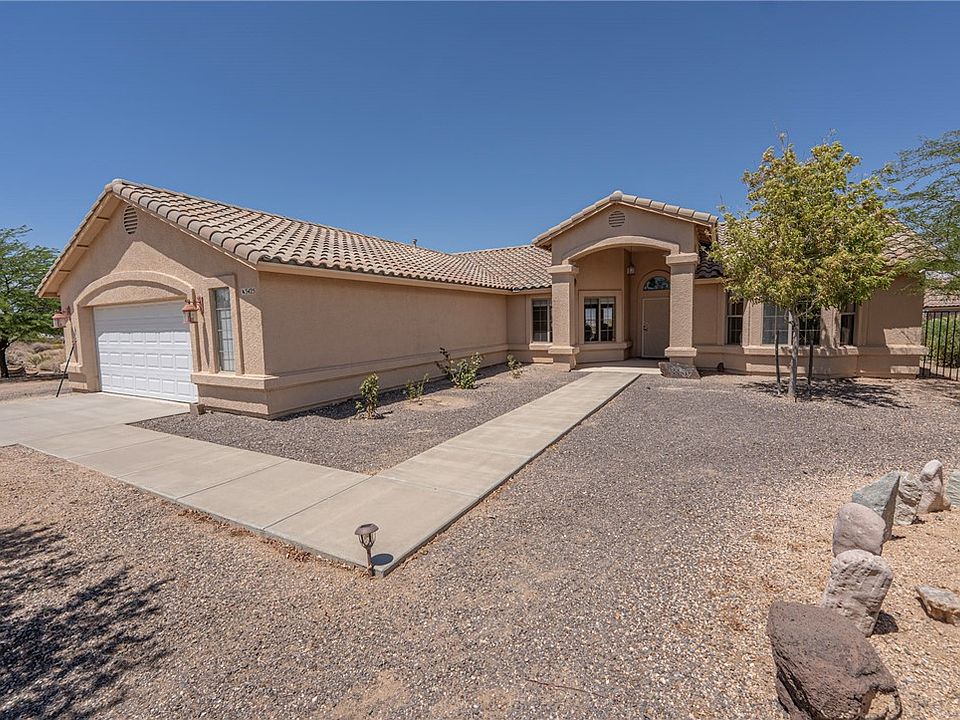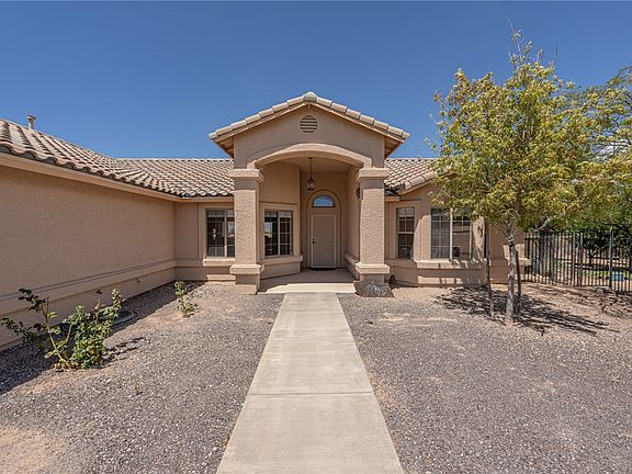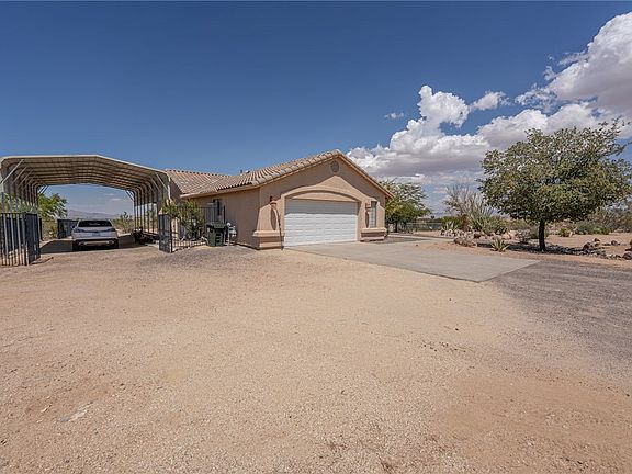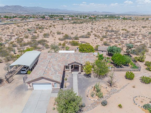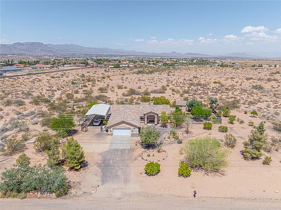 Welcome to this spacious 3-bedroom, 2-bath home offering 1,892 sq ft of comfortable living space on just over an acre in a peaceful Kingman setting. Step inside to find an inviting open floor plan with vaulted ceilings, tile flooring, and abundant natural light. All rooms, including the primary bedroom, are generously oversized, offering a true sense of space and comfort. The living room features a stunning stacked-stone gas fireplace, perfect for cozy evenings, and flows seamlessly into the casual dining area and large kitchen with a breakfast bar, generous counter space, and plenty of oak cabinetry. The oversized primary suite boasts a large walk-in closet and a large walk-in shower. Each guest bedroom is oversized as well and features dual closets, with one bedroom offering extra built-in storage near the window with a beautiful view, making it perfect for guests or a home office. A large laundry room with extra cabinetry adds convenience and storage. Recent upgrades add peace of mind, including a brand new HVAC system, newer appliances such as the dishwasher, gas dryer, microwave, and stove, plus ceiling fans throughout the home for added comfort and efficiency. Outdoors, you'll find the true standout features a 2019 custom RV carport with full sewer/water connection and 50-amp electric service, ideal for motorhome storage or visiting guest. The attached climate-cooled 2-car garage with extended bay easily accommodates trucks or oversized vehicles and includes a dedicated workshop section for tools, storage, and projects. For those who love outdoor living, the property offers an exceptional garden with automatic irrigation and a variety of fruit trees including peach, pecan, apricot and olive providing both beauty and bounty. A tiled shed with a mini workshop expands the possibilities for hobbies, crafts, or additional storage. The backyard is a peaceful retreat with sweeping mountain and city views, and the extended covered patio is perfect for outdoor dining, entertaining, or relaxing year-round. The fully fenced yard ensures privacy and provides plenty of space for additional parking or projects. Additional highlights include low-maintenance landscaping and a thoughtful balance of comfort, utility, and charm. This home truly combines function, lifestyle upgrades, and views all within minutes of Kingman's amenities. A must see!