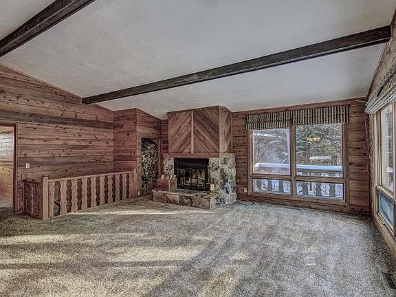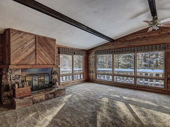 N. CARPENTER LAKE ROAD HOME - Well maintained 3 bedroom, 2 full bath TimberShore home on 4.94 acres. Large living room with wood burning fireplace and wall of windows for plenty of sunlight. Finished basement includes rec room, gas fireplace, bedroom and full bath. Wrap around deck overlooks the wooded yard. Detached 3 car garage with extra storage, fenced in yard and stone retaining wall round out this must see home.