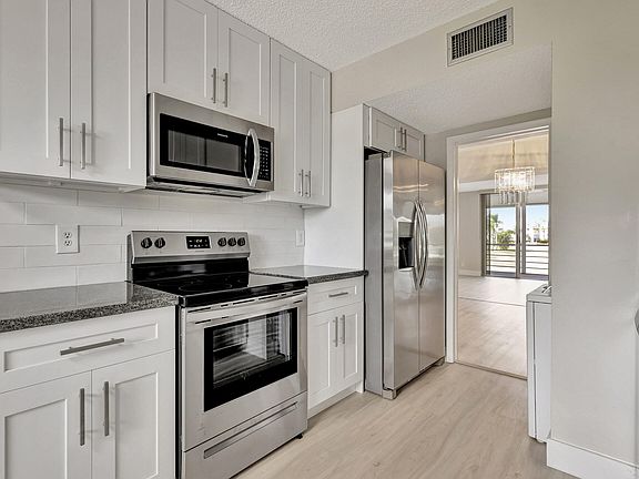 Welcome to this stunning 2-bed/2-bath condo that has been recently renovated beautifully. As soon as you enter, you'll be greeted by a spacious foyer that leads to the living area, which is illuminated by natural light and looks out onto the large, screened-in patio that offers a beautiful view of the Poinciana golf course. The kitchen, living, bath, and bedroom areas have all been fitted with top-quality, premium waterproof flooring. The eat-in kitchen has been updated with new wood cabinets that offer ample storage space, as well as granite countertops. Both bathrooms have been updated with marble vanity tops and have low-threshold walk-in showers. The condo has a split bedroom floor plan that provides guests with privacy with an adjacent bath, as well as spacious bedrooms. The primary bedroom offers a large walk-in closet. In addition to all of these features, the unit also comes with stainless-steel appliances that are just one year old, a pantry, and an in-unit stacked washer and dryer. The Barclay building has a pool next to the building, and It is conveniently located near the clubhouse, which offers even more amenities such as an additional pool, fitness center, tennis courts, pay-as-you-play golf, Mel's Bistro, movies, shows, trips, and more - No membership required. Barclay is close to the Turnpike, the Wellington Mall, and restaurants. The seller agrees to pay two upcoming special assessments totaling $26,500.00 at closing. Any additional amounts beyond this total will be the responsibility of the buyers.