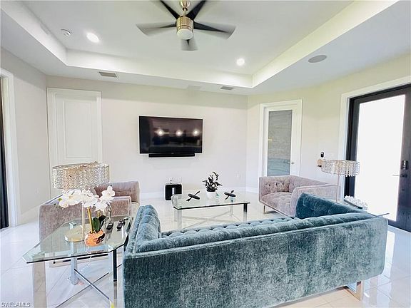 Presenting a recently constructed residence boasting 3 bedrooms, 2 bathrooms, and a den, strategically situated in the desirable Golden Gate Estates. Highlighting tray-style ceilings in both the living room and master bedroom, this home is equipped with built-in speakers, perfect for hosting gatherings. The master bathroom includes his and hers vessel sinks, complemented by a guest bathroom with an additional vessel sink. Revel in the expansive use of oversized tile throughout, enhanced by generous-sized baseboards and pristine white quartz kitchen countertops. Step onto the tiled patio, and appreciate the convenience of a climate-controlled garage. Seize the opportunity to own this contemporary-style home with a multitude of features!