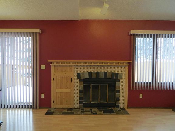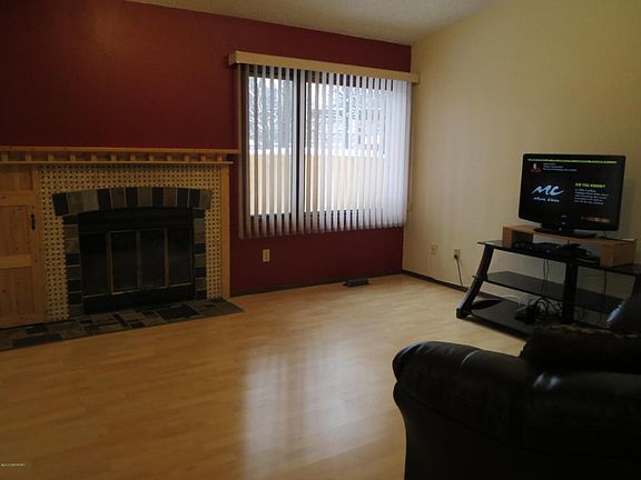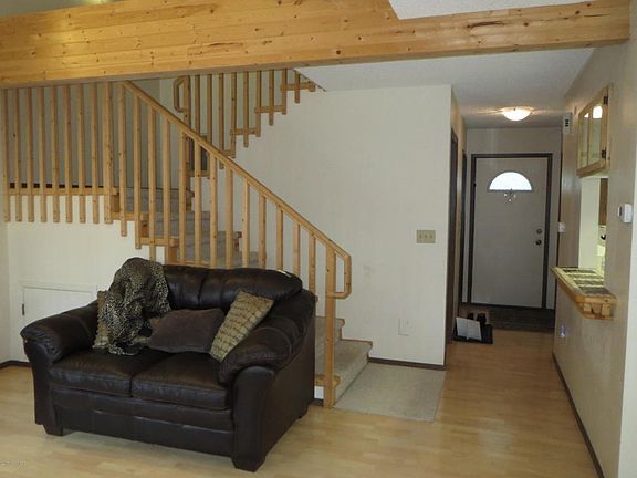 This 2 bedroom, 1.5 bath townhouse style condo has been updated with laminate flooring, custom birch handrail, designer paint, updated lighting, kitchen has B/I microwave, and was updated with pass through bar with stone and tile accents, Energy upgrades to incl. hot water tank, furnace, garage furnace, & insulation. Private fenced backyard. month. Great location to either UMED/JBER. Dues 170.00