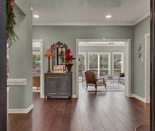 Absolutely stunning home located in The Thicket at Cypresswood! Upgrades throughout this entire home, starting at the recent front door. Step in to classic elegance with wood-look tile flooring, extensive crown moldings and trim work complimented by the cool neutrals of the walls. Formal living could also serve as a private study or additional entertaining space, featuring a double-sided gas fireplace, wall of windows overlooking the amazing backyard and an abundance of bookshelves. Completely renovated kitchen is a true show piece with center island, quartzite counters, soft-close cabinets, farm sink, lighting and appliances. Double pocket doors lead to the enclosed laundry space which also features the pantry cabinets. First floor primary suite with updated bath. Pool/spa and beautifully landscaped backyard create a fabulous outdoor living space. Gated driveway leads to the double car garage plus double carport. Too many features to list! This property will not LAST!