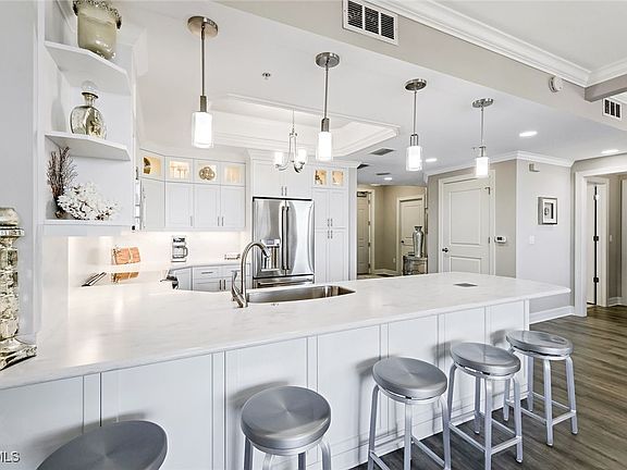 Experience elevated waterfront living in this beautifully furnished, one-of-a-kind condo at the prestigious North Star Yacht Club. Tastefully renovated, this residence greets you with floor-to-ceiling windows that showcase sweeping views of the marina canal, river, and resort-style pool. The expanded kitchen is a true showpiece, featuring custom cabinetry, designer lighting, a tray ceiling, and an oversized countertop that combines style with functionality. Thoughtful upgrades—including pop-up electrical outlets and a state-of-the-art refrigerator that brews coffee—seamlessly blend modern convenience with sophistication. The den/guest bedroom serves as a versatile retreat, enhanced with custom built-ins, a wireless in-counter phone charger, and a space-saving Murphy bed. Residents enjoy more than 15,000 sq. ft. of amenities, including a luxurious clubhouse, theatre, billiards, card and mah-jongg rooms, aerobics and fitness center, steam and locker rooms, a heated pool and spa, plus lighted tennis and three pickleball courts—all set on 12.5 acres of lush waterfront grounds. The Structural Integrity Reserve Study has been completed, no Milestone inspection is required at this time, and reserves are fully up to date.Lease a slip in the marina or take a leisurely waterfront stroll to four nearby restaurants. Or, hop on the free seasonal trolley to Fort Myers’ revitalized River District, home to more than 60 restaurants, shops, galleries, theaters, and entertainment venues.