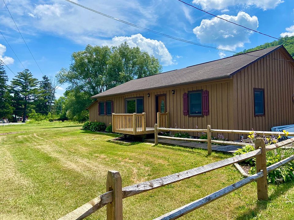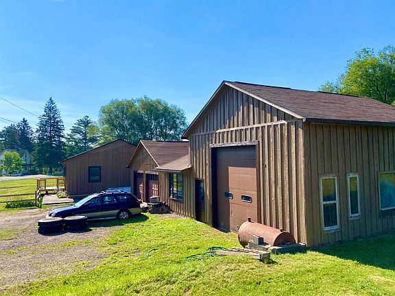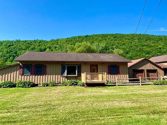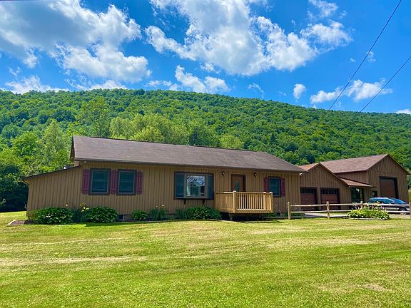 This adorable ranch home is located outside the village of Andes and offers a great deal of flexibility. The 3 bedrooms 2 bathroom home has lots of natural light and an intuitive layout. It features hardwood floors, an open floor plan, and rear exterior deck. While all the big stuff has been done, there is still finishing work that needs to be completed which allows you to make it your own. Bring your vision and ideas!There is a detached garage with an office space and large 26x18 room that was previously used as an auto repair shop. There is a working lift for working on cars. For those looking for a live / work opportunity this could be a natural fit. The property is being sold as is.The property is bordered by Protected land on all sides and it is located on Route 28 offering high visibility and real convenience. The property borders the Bryant Brook and is minutes from the villages of Andes and Margaretville.