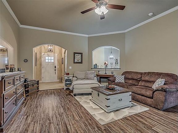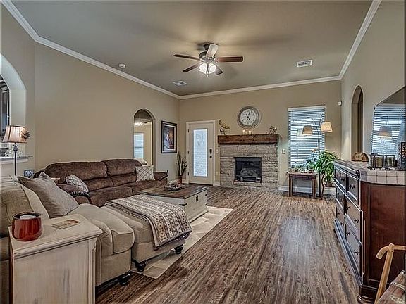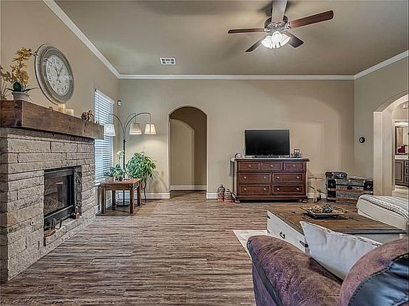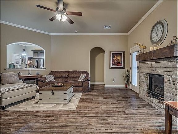 Like Brand NEW but better! This immaculate home features 4 beds, 2 baths, with an open floor plan and great backyard! The spacious kitchen boasts stainless appliances including gas stove and upgraded dishwasher. The kitchen also includes an island, breakfast bar, and walk in pantry. The spacious living room showcases a gorgeous gas fireplace, new flooring, and tall ceilings. The master suite features vaulted ceilings and has attached bathroom with jetted tub, double sinks, and large walk in shower! The master closet walks through to the laundry room for added convenience. Across the home find three additional bedrooms, hall bathroom, and tons of storage with great built in cabinetry. Outside, the back yard showcases a beautiful pergola, some updated fencing, storage shed, and lovely landscaping, a perfect place to enjoy the sunset. Other updates include storm shelter, new roof 2024, and updated lighting and electrical inside and out.