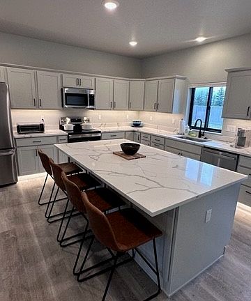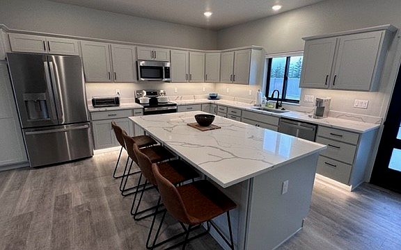 Scheduled for early 2024 delivery. Quail Meadows is North Kalispell's newest community, offering all single story, mountain modern homes just minutes from all the necessary conveniences while still embracing that Big Sky attitude. This 3 bedroom 2 bath home includes features and finishes sure to impress including: Quartz counters, beautiful cabinets with soft close hardware, kitchen island, luxury vinyl plank flooring, washer, dryer, refrigerator, microwave, water softener, fully landscaped and irrigated, full perimeter fencing and a 2 car heated garage. Foam insulated stem walls with concrete floors in crawl space. This home offers views! Bring your furniture, that's all you'll need! For additional information call Larry Sartain at 406-871-5000 or your real estate professional. " Quartz Counter Tops Throughout with Undermount Sinks " GE Appliances including: Refrigerator, Microwave, Oven/Range, Dishwasher " Water Softner " LG Washtower Washer and Dryer " Provenza Luxury Vinyl Plank Flooring with Limited Life Time Warranty " Dream Weaver Carpeting in Bedrooms " 2 Panel Shaker Style Interior Doors " Shaker Style Kemper Cabinets with soft close hardware " Anderson Windows " Pabco Premier Architectural Roof Shingles with Limited Lifetime Warranty " R-60 Insulation in Ceiling and R-21 in Exterior Walls " Sherwin Williams Paint Interior and Exterior " Full Landscaping with Underground Sprinklers " Ply Gem Privacy Fencing with Limited Life Time Warranty " All electric, energy efficient forced air heating and air conditioning " Insulated Garage doors with auto-openers