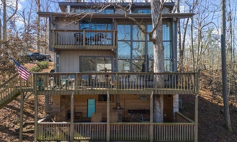 Double Decker Dock/Single Slip Boathouse on DEEP WATER cove, undisturbed by boat traffic on LAKE LANIER near Gainesville Marina Dock. Permit recently renewed. This is your chance to own and enjoy a lake house for personal use and/or an investment opportunity (sleeps up to 12!). Many a fun gathering has been had at this home--inside in the open living area, on one of the two large decks overlooking the water, and at the double decker dock! This sweet home is located in a cove that is perfect for fishing, paddle boarding, boating, or just floating in the sun! Just stroll on down the newly landscaped walkway and take the new Trex bridge over to the dock. Inside, the two story living space has hardwood floors and soaring windows overlooking the water plus a freestanding wood burning stove. A half bath is conveniently located off the kitchen, which has a new electric range, new dishwasher, and new garbage disposal. Hot water heater is new, too. The primary bedroom is on the main level. Upstairs you will find two spacious bedrooms (one with a personal deck with lake view), two full baths, and laundry. Ten minute drive to Gainesville Square; 5 minutes to groceries, shopping and restaurants If you love lake life and want to reap all the benefits of enjoyment and investment, this one is perfect for you! PHOTOS COMING 2/4! Please note: The tree that grow up through the decks has been checked by an arborist. High pool is 20 feet. Low pool is 12 feet.