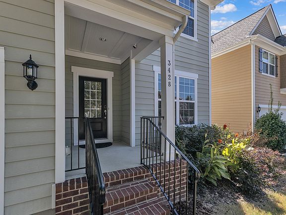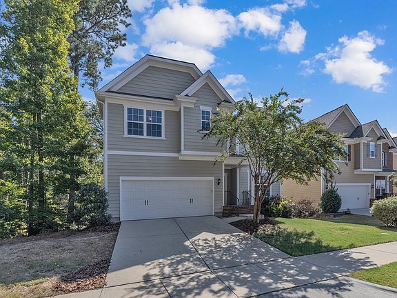 Luxury home nestled on a quiet, private wooded lot at the end of the street. Desirable 3-story floor plan with 6 large bedrooms and 5 full bathrooms including an expansive owner's suite. Open concept main floor is a great gathering space for entertaining, with bedroom, full bath, dining room, living room w/FP, kitchen & large windows that leads onto the screened porch and balcony overlooking woods and backyard. Living room opens into a huge gourmet kitchen w/granite counters, SS appliances, two islands, pantry, eat-in area. Upper floor offers 4 bedrooms, 3 full baths, laundry room w/cabinets, utility sink & countertops. Enormous primary suite w/sitting area, sep. tub, shower, WIC, lots of windows and light with a covered porch overlooking the woods. Lower level offers flexibility for additional living, office, relaxation space including bedroom w/ WIC, bathroom with dual shower heads, huge activity space, flex room, patio that opens into the back yard with separate entrance - could be easily converted to a separate apartment. 2 car garage includes epoxy floors and plentiful custom storage shelves. Other features include: 9 foot ceilings, hardwood on main floor, wired with Google Fiber for 1 to 8 GB internet service, multi-zoned HVAC, main HVAC (2020) and roof (2022) replaced in the last few years. Community amenities: wooded greenway trails, luxury pool, playground & clubhouse. The home's location provides convenience, being just minutes away from shopping, dining, I-540, Research Triangle Park, RDU International Airport and a neighborhood pool, making it a perfect blend of upscale living and accessibility. Bring your nature lovers and chefs to enjoy this beautiful and comfortable spacious home.