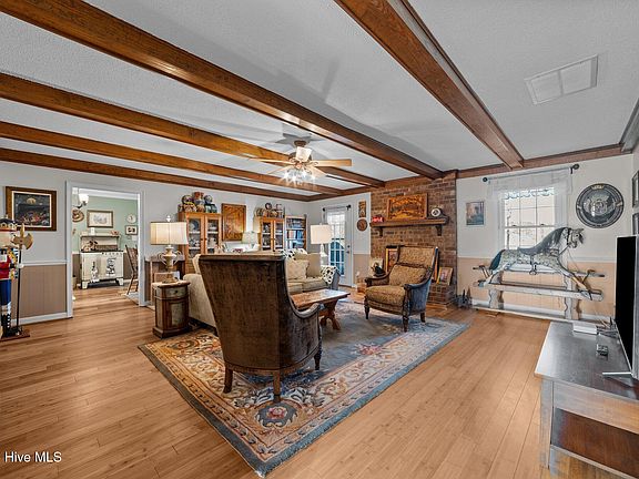At nearly 2,000 square feet of well designed space, the home features 3 generously sized bedrooms & 2 well-appointed baths. A standout feature is the expansive covered rocking chair front porch, perfect for enjoying tranquil mornings or evenings while overlooking the 2.72 acres of land. The heart of the home is the large kitchen & dining area, which boasts new quartz countertops & a custom island that enhances both functionality & style along w/ modern appliances such as new microwave & French door refrigerator. Formal dining option also available, allowing for elegant entertaining. The family room, complete w/ cozy fireplace, provides a warm & inviting atmosphere for relaxation & gatherings.
