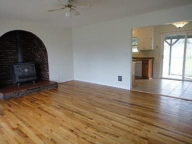 Large Fenced Yard offers pedi gate to Soccer Fields. Private covered back porch. Wood floors throughout the home, wood stove, cadet heating and window a/c provided. 12 month lease term 1 Small pet negotiable No utilities are included in the monthly rent.