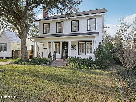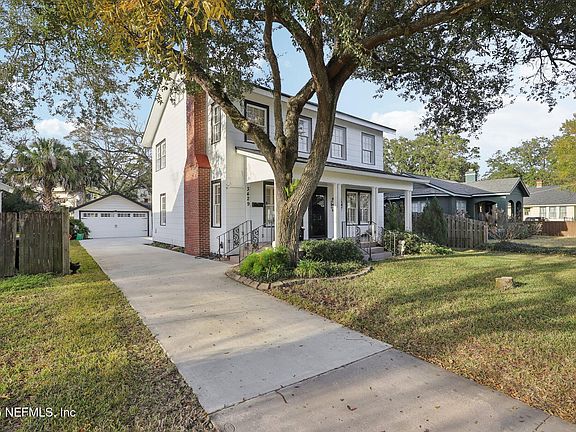 Nestled in the heart of historic Murray Hill, this stunning 1936 home blends timeless charm with modern upgrades. Situated on a spacious .22-acre lot just minutes from downtown Jacksonville and the South Bank, it offers both space and convenience. A new roof, gutters, driveway, and garage door system reinforces durability and functionality, while the freshly painted exterior enhances its curb appeal. The large covered front porch welcomes you inside, where original hardwood floors, plantation shutters, and a gas fireplace create a warm, inviting atmosphere. The recently remodeled kitchen features granite countertops, an electric range, and ample storage, seamlessly complementing the home's character. The fully repiped plumbing system includes a new gas-powered water heater, and a 200-amp electrical panel has been installed, Recent upgrades may facilitate a favorable four-point inspection. Outside, a 12' x 20' storage shed and detached two-car garage provide ample space, with a private entrance for secure parking. Historic blown-glass windows add to the home's unique charmSome historic windows remain sealed for authenticity and efficiency. All appliances convey, making this a move-in-ready gem in a highly sought-after neighborhood in Jacksonville.
