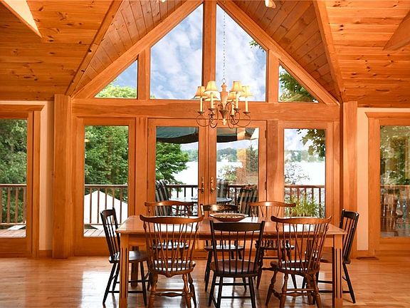Semi private lakefront close to village features open floor plan with cathedral ceilings. Glass spans entire width of home and three sets of French doors open to a magnificent deck with panoramic lake views. Lake access is less than 200' away and provides dockside access to your boat. Owners hoist and mooring ball will convey. Updated bathrooms, lovely hardwoods throughout, a gas and wood burning fireplace & 8-burner commercial grade stove are just a few of the many other amenities.